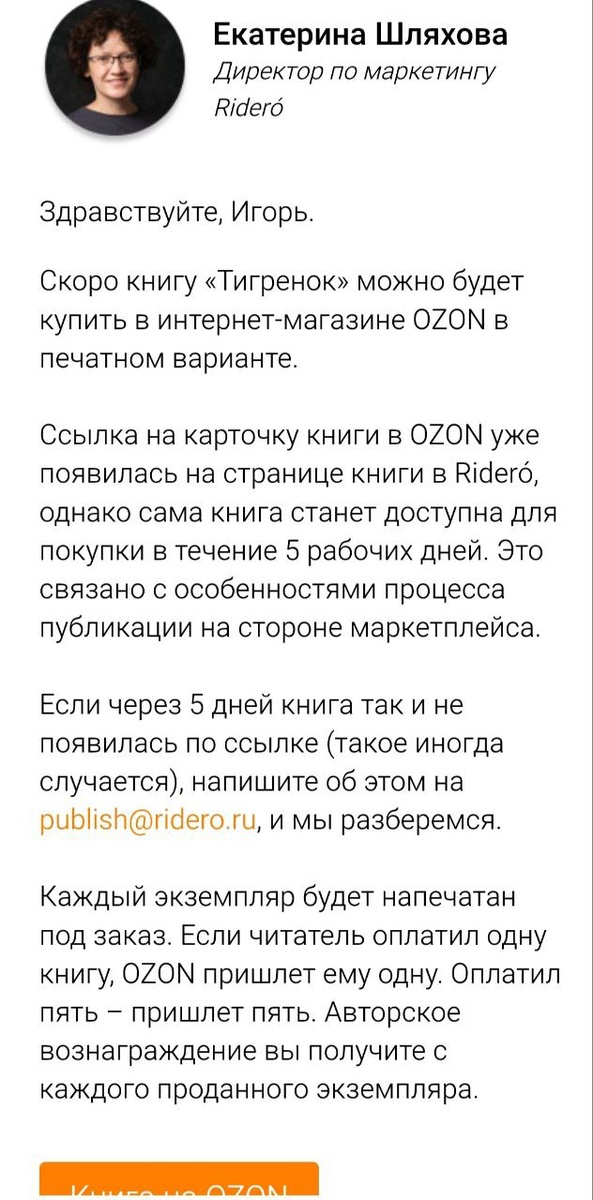 произведение, пройти модерацию и т. д. Но ни как не ожидал что рассказ появится в продаже на ОЗОН https://ozon.ru/t/dQRREEE и на ВБ https://www.wildberries.ru/catalog/779815955/detail.aspx?size=1146888274 И на сайте Ридеро она на днях появилась для ознакомления с конкурсантами и голосованием. https://ridero.ru/listing/vse-svyazano/ И первый отзыв от читателя пришёл https://ridero.ru/books/tigrenok_2/ Понятно что никто её не купит, но сам факт существования книги в продаже радует 📚 И на ОЗОН цена выше чем на ВБ, почему то...