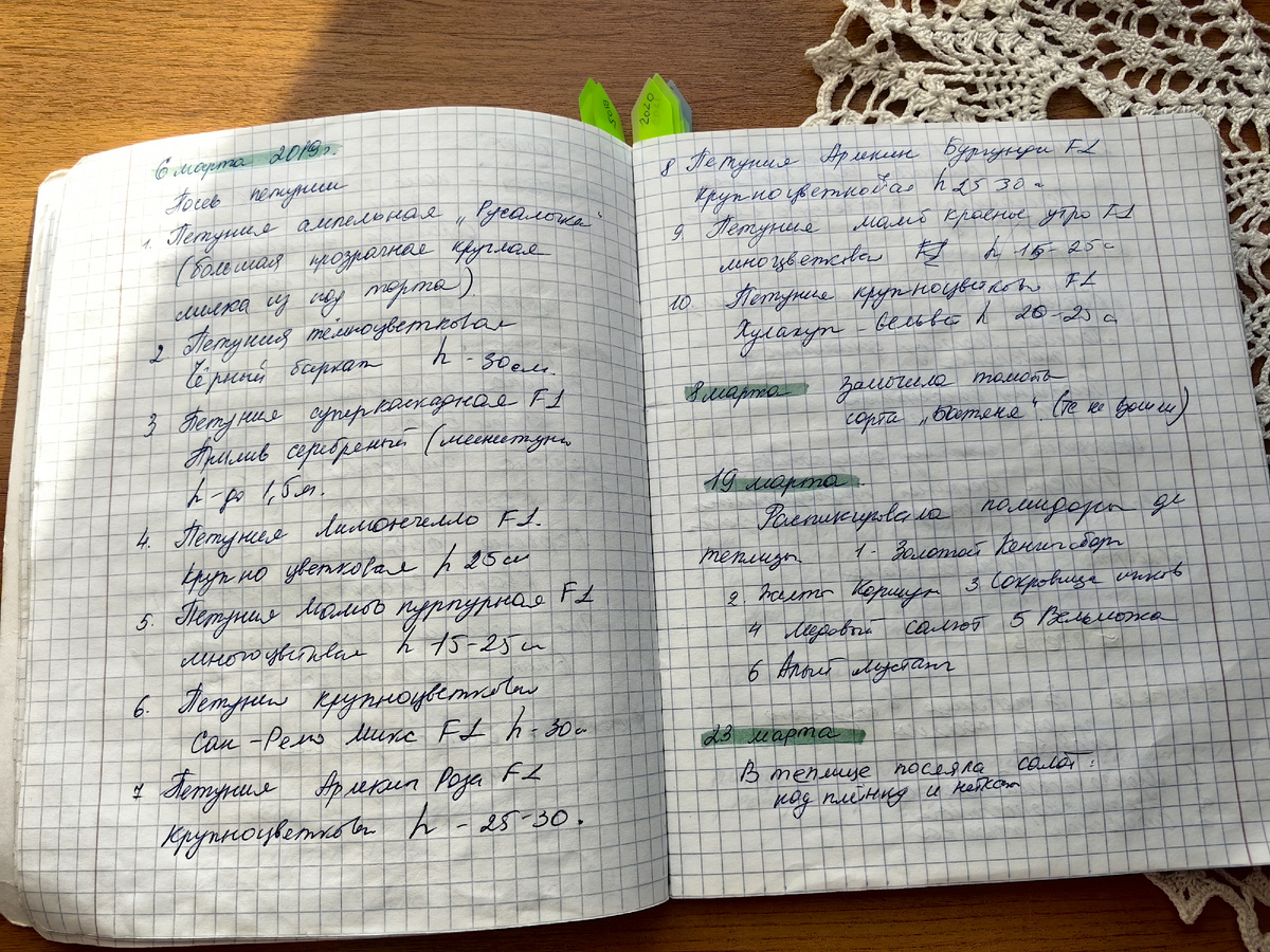 Сегодня хочу немного рассказать о своём опыте использования садово-огородного дневника. Пять лет назад у меня уже была о нём статья на канале, но было это уже очень давно, опыта по ведению дневника у меня прибавилось, а в этом году еще и есть о чём ещё рассказать и с чем сравнить. Вот ссылка на ту самую первую статью. Свой самый первый садово-огородный дневник я завела в конце 2017 года, чтобы вести записи с нового 2018 года. Это была обычная тетрадка на 48 листов. По месяцам каждый год я вносила все свои работы, связанные с посадкой рассады, пересадкой, отмечала, как взошли те или иные культуры. Чуть позже стала добавлять свои наблюдения за погодой, записывать особенно какие-то необычные явления. Это так интересно читать, к примеру, что в таком-то году в апреле выпал снег или, наоборот, стояла жаркая погода, и температура поднималась в том же апреле, только в другом году до +25 Ведение этого дневника мне очень помогает определиться со сроками посева растений на рассаду, выясн