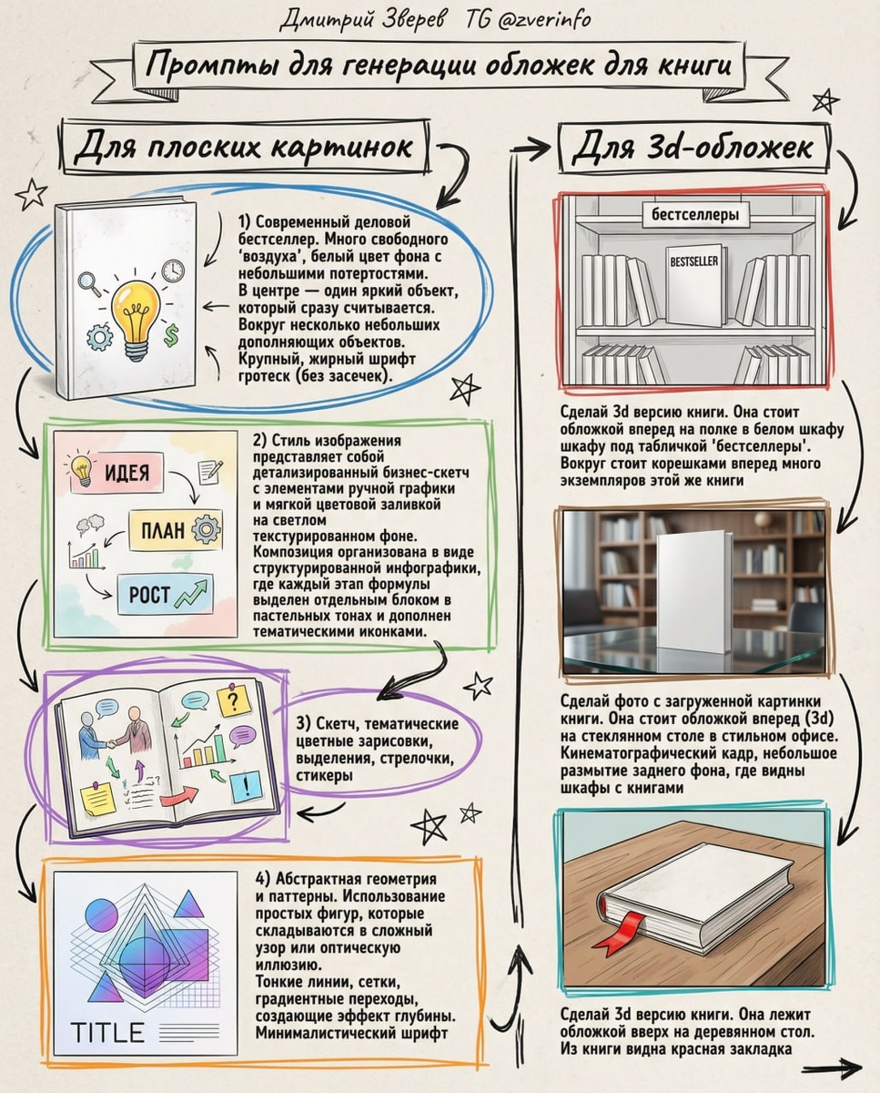 Недавно в моем клубе обсуждали этот вопрос и пришли к двум основным выводам: 1) сейчас реально сделать стильную красивую обложку буквально за 5-10 минут. Буквально. Причем - или вообще бесплатно, или примерно по 5 рублей за каждую генерацию. И не нужны никакие отдельные сервисы для создания 3d-обложек 2) удивительно видеть "спецов", которые до сих пор на биржах фриланса/в поддержках сервиса вроде Литрес предлагают свои услуги по созданию простеньких обложек за 2-3-5 тысяч рублей. Как же все сделать? В этом посте собрал 7 стилей для генерации. Сначала - для плоских картинок: ✔️Современный деловой бестселлер. Много свободного «воздуха», белый цвет фона с небольшими потертостями. В центре — один яркий объект, который сразу считывается. Вокруг несколько небольших дополняющих объектов. Крупный, жирный шрифт гротеск (без засечек) с идеальным кернингом. ✔️Детализированный бизнес-скетч с элементами ручной графики и мягкой цветовой заливкой на светлом текстурированном фоне. Композиция организов