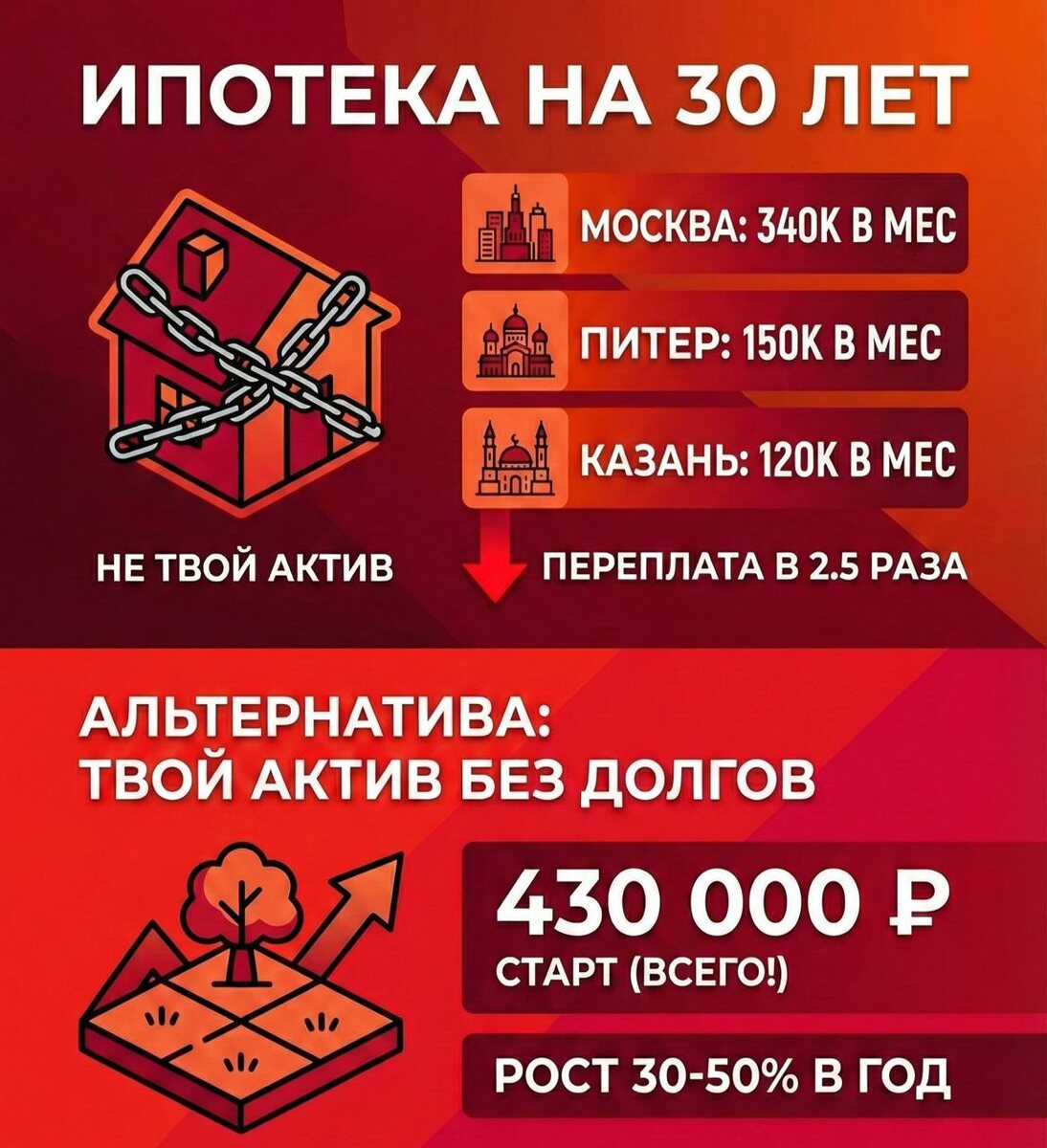 И именно здесь совершается главная ошибка. Ипотека на 20–30 лет не решает вопрос жилья - она фиксирует тебя в долговой модели. Факты простые: • чтобы взять ипотеку, нужна зарплата как у топ-менеджера; • Москва от 340 000 ₽, Питер 150 000 ₽, Казань 120 000 ₽; • у скольких людей в стране реально такая белая зарплата? А теперь ключевой вопрос: что если поменять порядок шагов? Не сначала ипотека, а сначала актив, который поможет купить ту же квартиру, но уже на других условиях. Сегодня земельный участок в Подмосковье можно купить от 430 000 ₽. 8–10 соток в растущей локации. С понятной логикой выхода и выхода. Земля — это инструмент: ✅ без ипотеки; ✅ без ежемесячных платежей; ✅ с ростом 30–50% в год; ✅ и с потенциалом стать первым шагом к квартире для жизни. По факту выбор такой: либо десятилетиями платить банку, либо сначала создать капитал и купить жильё без удушающей нагрузки. Если хочешь подобрать земельный участок под свой бюджет и цель — пиши «ЗЕМЛЯ» в комментариях или в ЛС @a