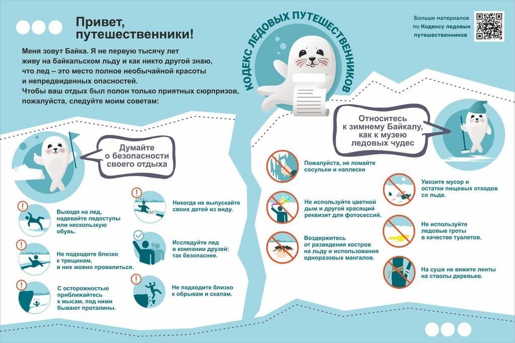 😉👍👍 В Байкальском регионе работает Кодекс ледовых путешественников ❄️Кодекс ледовых путешественников – это свод правил поведения на льду Байкала, главная цель – обезопасить путешественников от возможных происшествий, защитить экологию озера и сохранить лед гладким и красивым до конца сезона. ❄️Кодекс разработан в 2021 году инициативной группой представителей иркутского туристического бизнеса, большой вклад внес туроператор «Байкалика» при активном участии Агентства по туризму Иркутской области и Сибирской Байкальской ассоциации туризма (СБАТ), гидов и гидов-переводчиков, гидов-проводников нашего региона. ❄️Авторы проекта подготовили практические рекомендации для туристов, гидов, турфирм, турбаз, наклейки для уазов и хивусов, а также картинки для соцсетей: как правильно организовать маршрут, пикник, приготовить обед, не оставив проталин на льду, подготовить и провести ритуал «поцелуй Байкала». ❄️Упор сделан на чёткое и оперативное информирование путешественников о том, как не тольк