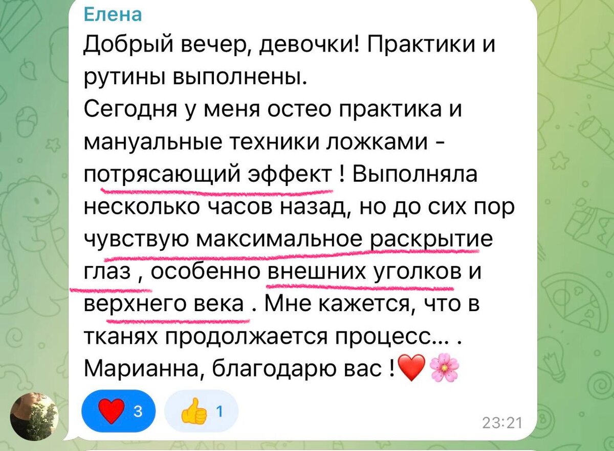 - выполнила несколько часов назад и до сих пор чувствую раскрытие, процесс в тканях продолжается Это действительно так. В практиках мы запускаем, активируем процессы на улучшение регенерации и потом в течение нескольких часов после занятия идёт важная и нужная работа. Так получаем изменения не только на уровне кожи, фасций, мышц, связок (локально), но и на глубинном уровне что дает замедление скорости старения. Это и есть омоложение, когда и чувствуешь себя лучше, больше энергии, бодрости и внешне выглядишь моложе, свежее.