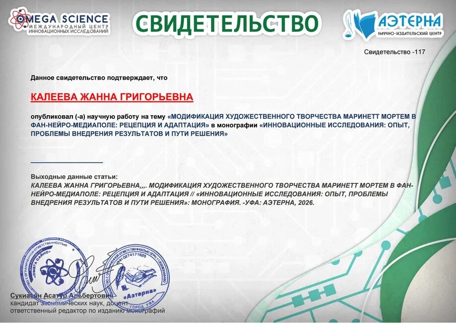 8. Калеева Ж.Г. Влияние творчества Маринетт Мортем на молодёжь как форма воспроизводства культурных шаблонов в цирковых перформансах и хоум-граффити// Международный научный журнал Инновационная Наука №12-2-2/2025 - С. 171-172. https://aeterna-ufa.ru/sbornik/IN-2025-12-2-2.pdf