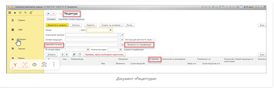 - рецептура. В документе «Рецептура» указываются параметры сырья, партии, нормативы готовой продукции для расчёта спецификации.