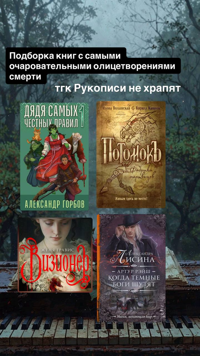 Для вас новая подборка: книги с самыми очаровательными олицетворениями смерти 🖤 "Визионер" Женя Гравис 🤍 "Дядя самых честных правил" Александр "Котобус" Горбов 🧡 "Потомокъ" Илона Волынская и Кирилл Кощеев 🤍 "Артур Рэйш" Александра Лисина Раньше всего отзывы и обзоры на книги выходят у нас в телегам. Подписывайтесь https://t.me/pro_novel
