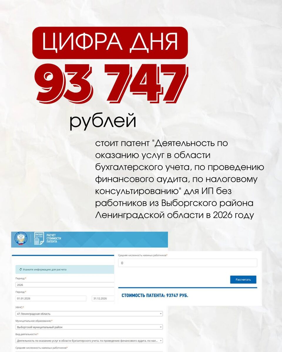? ✅Получить патент на услуги бухгалтера можно, если такой вид деятельности есть в региональном законе о ПСН. Скажем сразу, что далеко не в каждом регионе есть такое. Например, патент для бухгалтеров есть в Ленинградской и Амурской областях, в республиках Удмуртия, Бурятия и Крым, а также в Камчатском крае. Стоимость патента на такие услуги зависит от количества физических лиц, которых ИП привлекает к работе и от потенциального дохода, который установил регион. Стоимость может сильно отличаться в разных регионах. Так, ИП без работников из Выборгского района Ленинградской области в 2026 году за такой патент заплатит 93 747 рублей, а бухгалтеру из города Белогорска Амурской области аналогичный патент на тех же условиях обойдется всего в 20 193 рубля за целый год. У нас на сайте вышла новая статья, где мы подробно разобрали: ➡️ Почему бухгалтеры хотят работать на патенте ➡️ Можно ли получить патент на бухгалтерские услуги для ИП ➡️ А если взять «похожий» патент? ➡️ Какие еще налоговые