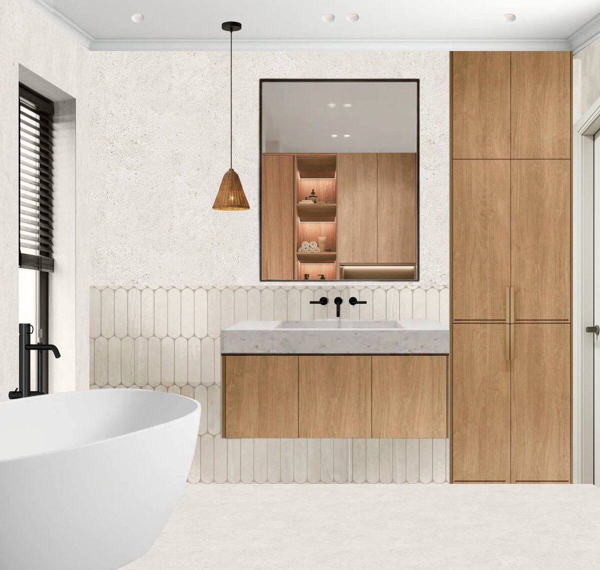 Один план — три разных интерьера В этом проекте мы показываем одну и ту же ванную комнату в трёх вариантах. Планировка остаётся неизменной, цветовая гамма — близкой, но решения и ощущения от пространства каждый раз разные. 🛀 Изначально в квартире были раздельные ванная и санузел. Заказчица придерживалась классического взгляда и хотела сохранить это решение. Но в процессе работы стало очевидно: объединение двух помещений открывает совершенно другие возможности. Именно так удалось разместить и полноценную ванну, и душ в строительном исполнении — редкая роскошь, которую может позволить себе не каждая планировка. В итоге это решение стало решающим. 💙 Общий запрос — максимально природная, спокойная ванная. В первом варианте мы используем нейтральные оттенки, светлое дерево и микроцемент. Мелкая плитка с акцентной формой добавляет глубины, не перегружая пространство. Подвесная тумба и минимальное количество открытых полок сохраняют ощущение лёгкости и порядка. ☁️ Небольшая, но очень
