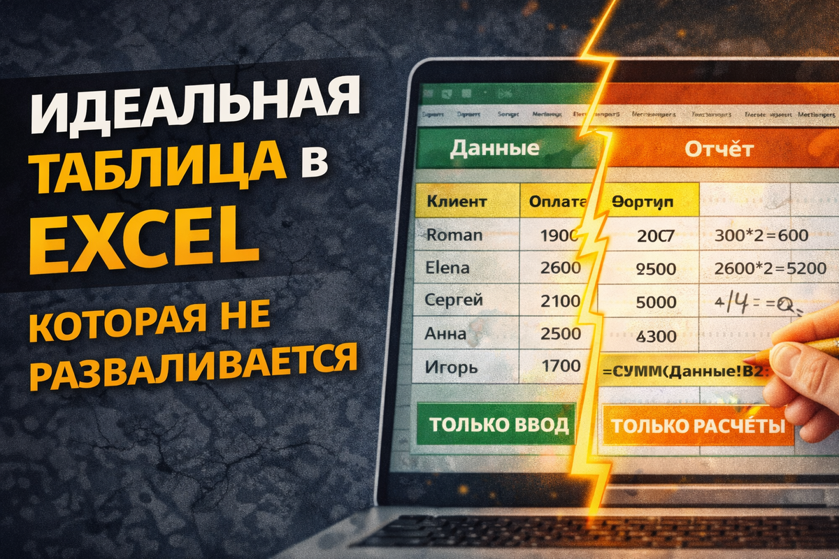 Часть 7. Идеальная структура таблицы, которая не разваливается. Как построить Excel-таблицу, которая выдерживает рост данных, правки коллег и не начинает «врать» через месяц работы. Excel ломается не из-за формул. И не из-за людей. Он ломается из-за неправильной архитектуры. Можно сколько угодно защищать листы, проверять формулы и следить за форматами — если структура изначально кривая, файл всё равно развалится. Просто позже. В 90% случаев всё смешано в одном месте: — ввод данных