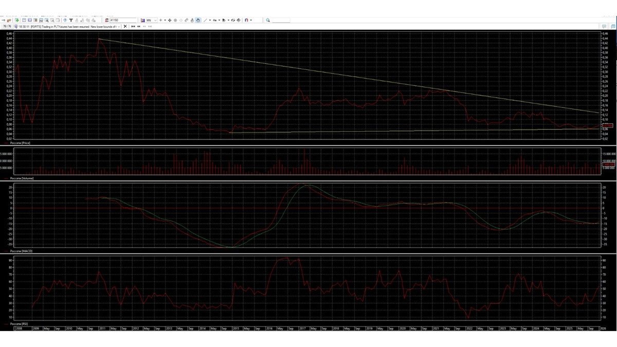 Дневной график показывает, что акция ФСК-Россети прилагает усилие уйти от линии поддержки бокового сужающегося коридора. Начиная с ноября 2025 года быки стали акцию от уровня 0,062 двигать вверх, по настоящее время быкам удалось поднять акцию к уровню 0,08. Как видим сил у них не хватило, чтобы пройти уровень 0,08, пошел откат до уровня 0,075. Окончательный ответ технический анализ не дает куда дальше идти. Пойдет ли акция дальше вниз или сделает попытку перейти в боковое движение и приступить к движению на 0,1. Все будет зависеть от новостного фона, что будет говорить компания насчет дивидендов, пока инвесторы надеются, что решение будет пересмотрено и выплаты начнутся в 2026 году. Индикатор RSI практически достиг уровня 30%, после сделал разворот и снизу вышел на уровень 50%, с готовностью пойти дальше наверх. Индикатор MACD располагается выше нулевого уровня и сверху приближается к нему. Объем торгов показывает повышение активности инвесторов в акции и возможно будет продолжение роста. Если роста активности инвесторов не будет высока вероятность, что акция готовится перейти в боковое движение.