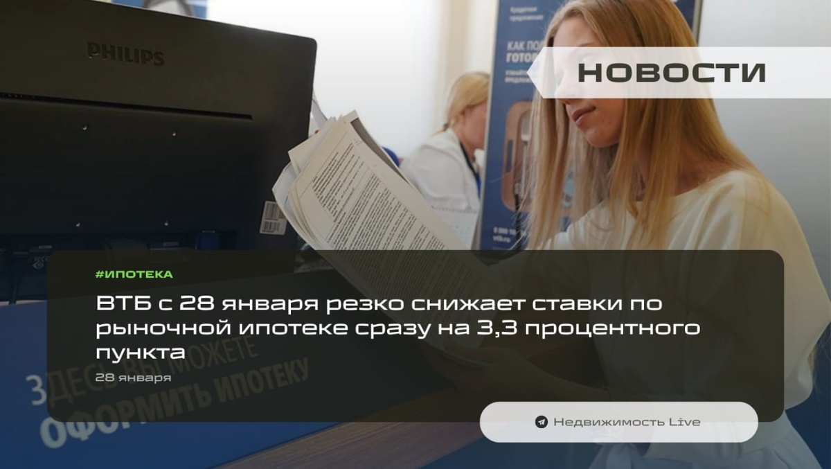 ⚡️ ВТБ с 28 января резко снижает ставки по рыночной ипотеке сразу на 3,3 процентного пункта — минимальная ставка теперь составляет 19,3