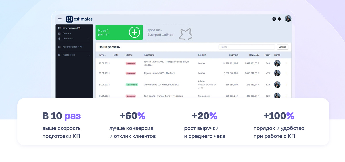 Плюсы: Скорость создания сложной сметы сокращается в 10 раз (с 2 часов в Excel до 10-15 минут), идеальный порядок в базе номенклатуры, высокая конверсия за счет прозрачности расчетов для клиента.