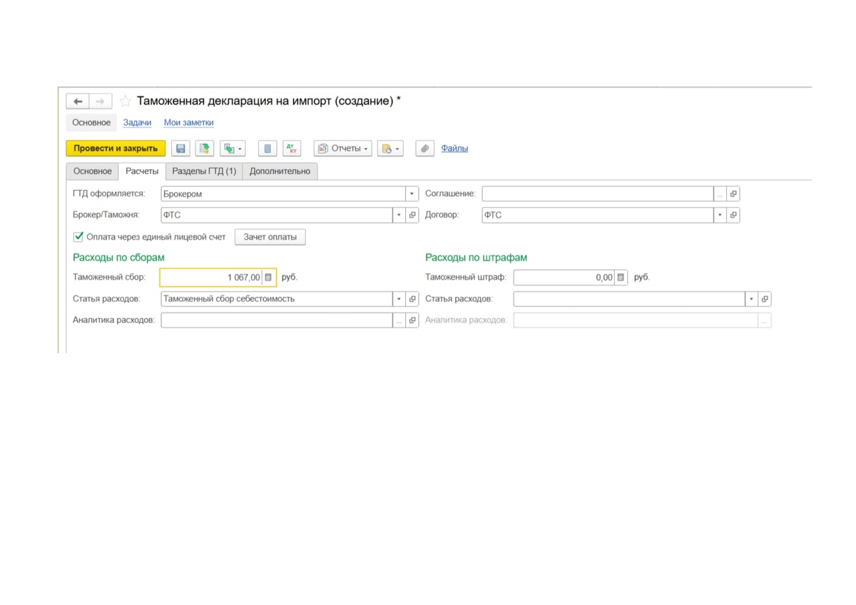 1. Оформление Таможенной декларации возможно только в Заказе поставщика (Приобретение товаров и услуг) с видом операции ИМПОРТ. Для этого можно в Заказе клиента выбрать Вид операции вручную или заранее установить в Типовом соглашении. Оформляем Приобретение товаров и услуг и переходим на вкладку Дополнительно, где заполняем Номер и Дату ГТД. Дату в документе Приобретение товаров и услуг также меняем на дату Таможенной декларации. Аналогичным образом заполняем все Приобретения товаров и услуг, для которых номер Таможенной декларации будет одинаковым. Номер ГТД указан справа вверху, дата – 6 цифр посередине (в примере …/061125/…. – 06.11.25. Далее переходим Закупки – Закупки – ГТД к оформлению Выделяем все документы по контрагенту и нажимаем Создать декларацию На вкладке Основное заполняем всю необходимую информацию Где 1010 – это код Таможенного сбора, а 5010 – это код НДС (п. 47) На вкладке Расчеты Указываем сумму Таможенного сбора, и если есть, сумму Таможенных штрафов. Заполняем ре