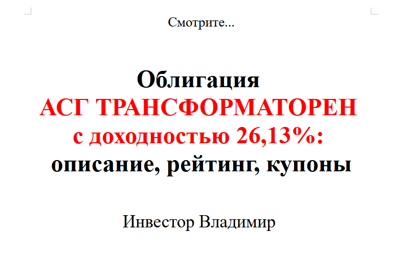 Здравствуйте, я Инвестор Владимир. 34 компании, 97 облигаций, т. е. примерно по 3 облигации каждого эмитента, ежемесячный пассивный доход по всем облигациям (купонный доход) составляет 2 094 рубля в месяц, на которые я регулярно докупаю новые облигации и кроме этого пополняю портфель каждый месяц на 10 000 рублей из собственных средств. Доходность портфеля составляет 25% годовых! Мне осталось купить всего 3 облигации и у меня в портфеле будет ровно 100 облигаций — первая маленькая победа! Медленно и уверенно иду к цели: 20 000 000 рублей за 15 лет! А теперь... 1) Эмитент - производит силовые, преобразовательные и специальные трансформаторы сухого типа под зарегистрированной торговой маркой АСГ ТРАФО 2) Рейтинг компании - Низкий 3) Доходность к колл-опциону - 26,13% 4) Дата погашения облигации - 29.11.2030 5) Дата выплаты купона - 23 число месяца 6) Купон - Фиксированный 7) Величина купона - 19,73 ₽ 8) Номинал - 1 000₽ 9) Количество выплат в год - 12 10) Субординированность - Нет Вчера