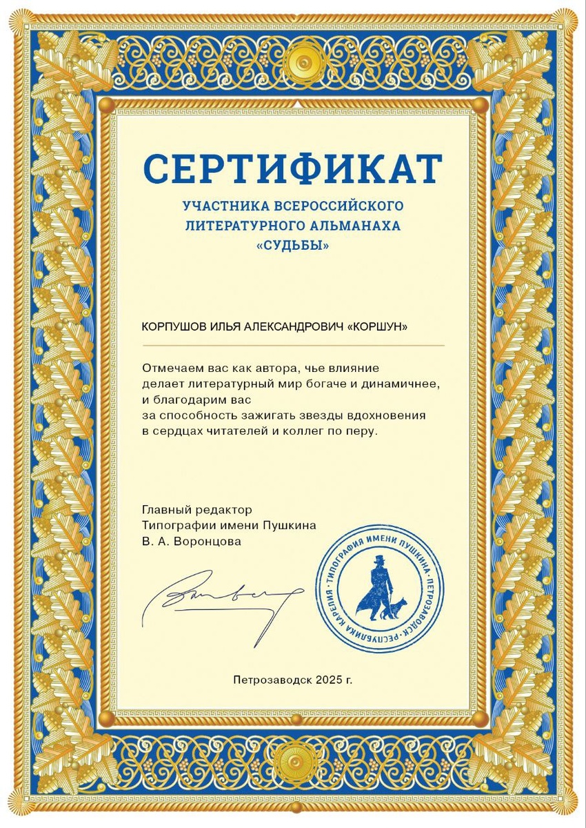 ! Благодарю за шанс участвовать во всероссийском литературном альманахе «Судьбы».