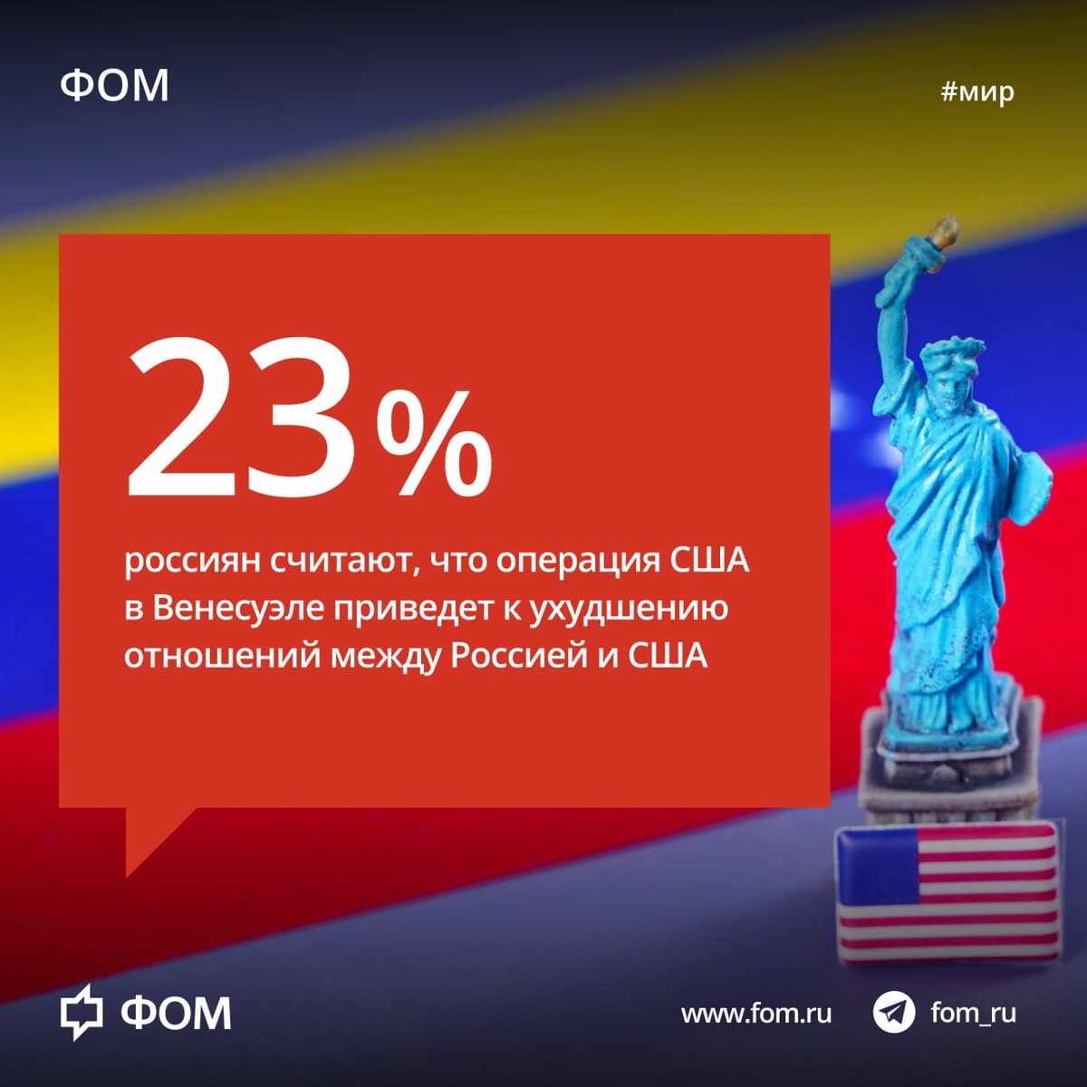 По данным опроса ФОМа, 23% россиян считают, что операция США в Венесуэле приведет к ухудшению отношений между Россией и США. В ночь на 3 января США захватили и вывезли из страны президента Венесуэлы Николаса Мадуро и его жену. В ходе операции были осуществлены кибератаки и ракетные удары по ряду объектов на территории Венесуэлы. Об этих событиях знают или что-то слышали 70% россиян. 50% относятся к действиям США скорее с осуждением, 16% – с безразличием. По мнению 52% опрошенных, руководство России отреагировало на эти действия правильно, 6% считают, что реакция должна была быть иной. Подробнее: fom.ru #внешняяполитика #Россия #странымира 📱 Фонд Общественное Мнение