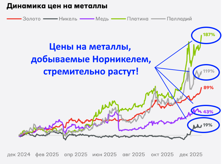 Инвесторы «Норникеля» находятся в парадоксальной ситуации. Компания генерирует значительный денежный поток на фоне ралли цен на металлы, её акции растут, однако настроения на рынке сдержанные. Причина — растущее недовольство миноритариев, которые не верят в скорое возвращение дивидендов, что формирует так называемый «дисконт Потанина». Производство и цены: конъюнктура в плюс, геология — в минус По итогам 2025 года выпуск никеля составил 199 тыс. тонн (‑3% год к году), меди — 425 тыс. тонн (‑2%), а палладия и платины остался на уровне 2024 года. Снижение объёмов связано с геологическим фактором: растёт доля вкрапленных руд с меньшим содержанием металлов, а доля богатых руд падает. Поэтому и на этот год запланировано снижение производства. Восстановление баланса ожидается не ранее 2028 года с началом отработки новых горизонтов на месторождениях «Скалистый» и «Скалистая». Однако этот спад в производстве компенсируется мощной ценовой конъюнктурой. Ключевые металлы «Норникеля» — медь, палла