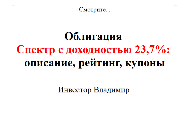 Здравствуйте, я Инвестор Владимир. На сегодняшний день в моем инвестиционном портфеле: 34 компании, 97 облигаций, т. е. примерно по 3 облигации каждого эмитента, ежемесячный пассивный доход по всем облигациям (купонный доход) составляет 2 094рубля в месяц, на которые я регулярно докупаю новые облигации и кроме этого пополняю портфель каждый месяц на 10 000 рублей из собственных средств. Доходность портфеля составляет 25% годовых! Мне осталось купить всего 3 облигации и у меня в портфеле будет ровно 100 облигаций — первая маленькая победа! Медленно и уверенно иду к цели: 20 000 000 рублей за 15 лет! А теперь... 1) Эмитент -занимается арендой и продажей спецтехники. ЛК Спектр входит в группу компаний AURORA и является участником Национальной ассоциации арендодателей строительной техники (НААСТ) 2) Рейтинг компании - Низкий 3) Доходность к погашению - 23,7% 4) Дата погашения облигации - 20.05.2027 5) Дата выплаты купона - 24число месяца 6) Купон - Фиксированный 7) Величина купона - 22,6₽