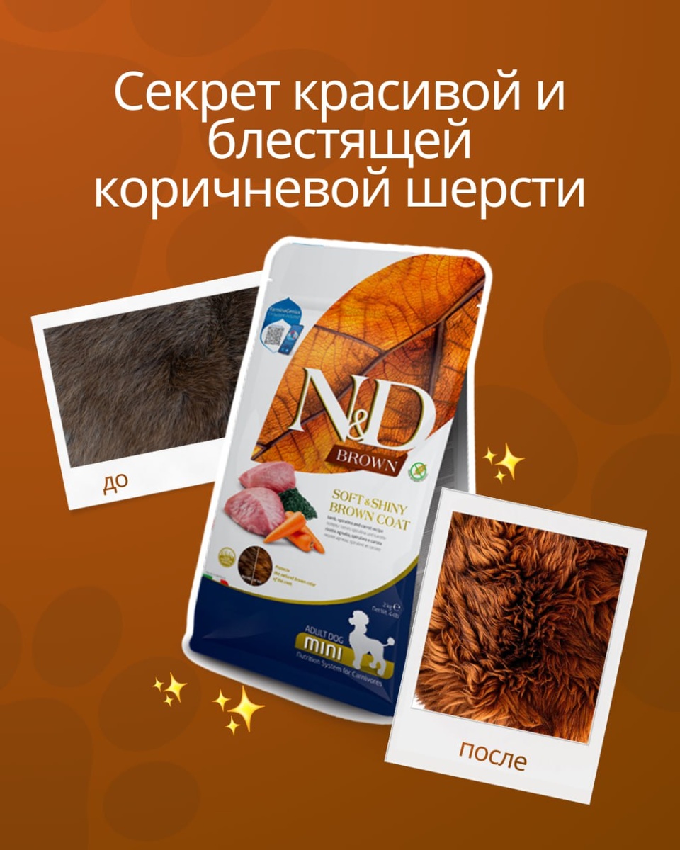 ! 🤎 N&D Brown Soft & Shiny Coat обеспечивает питание, необходимое собакам с коричневой шерстью. Это полнорационный корм, разработанный для того, чтобы шерсть питомца стала заметно более густой, а ее цвет - более насыщенным. Пишите нам по вопросам питания ваших пушистых друзей: - чат-бот, - консультация на сайте.
