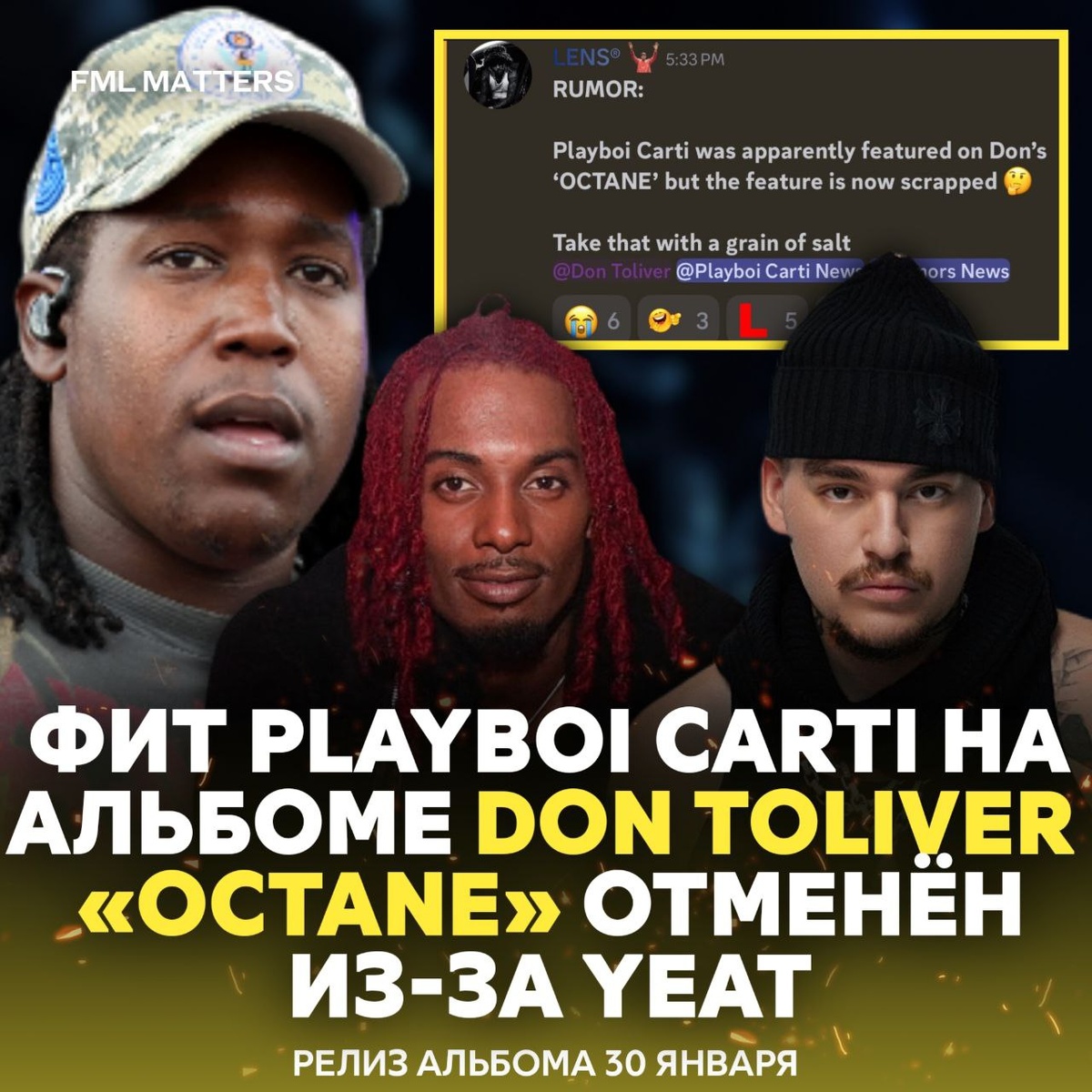 ❌ ФИТ PLAYBOI CARTI НА «OCTANE» ОТМЕНЁН ИЗ-ЗА YEAT! Согласно слухам от инсайдеров, в том числе от известного источника LENS, Карти должен был стать гостем на грядущем альбоме Дона «OCTANE», но его участие было отозвано. Фанаты строят теории, что фит убрали из-за присутствия на альбоме другого гостя — Yeat. Мнение? 🤔 💀 FML MATTERS