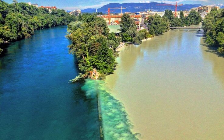 В швейцарском городе Женева, в районе Жонксьон есть место где пересекаются реки Рона и Арв.