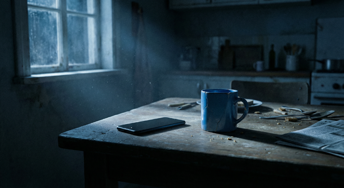 Смотрел на отцовскую кружку на полке. Синяя, с трещиной на ручке. Он пил из неё чай каждый раз, когда приезжал. Мама хотела выбросить — старая, щербатая. Отец не давал. Говорил — привык.