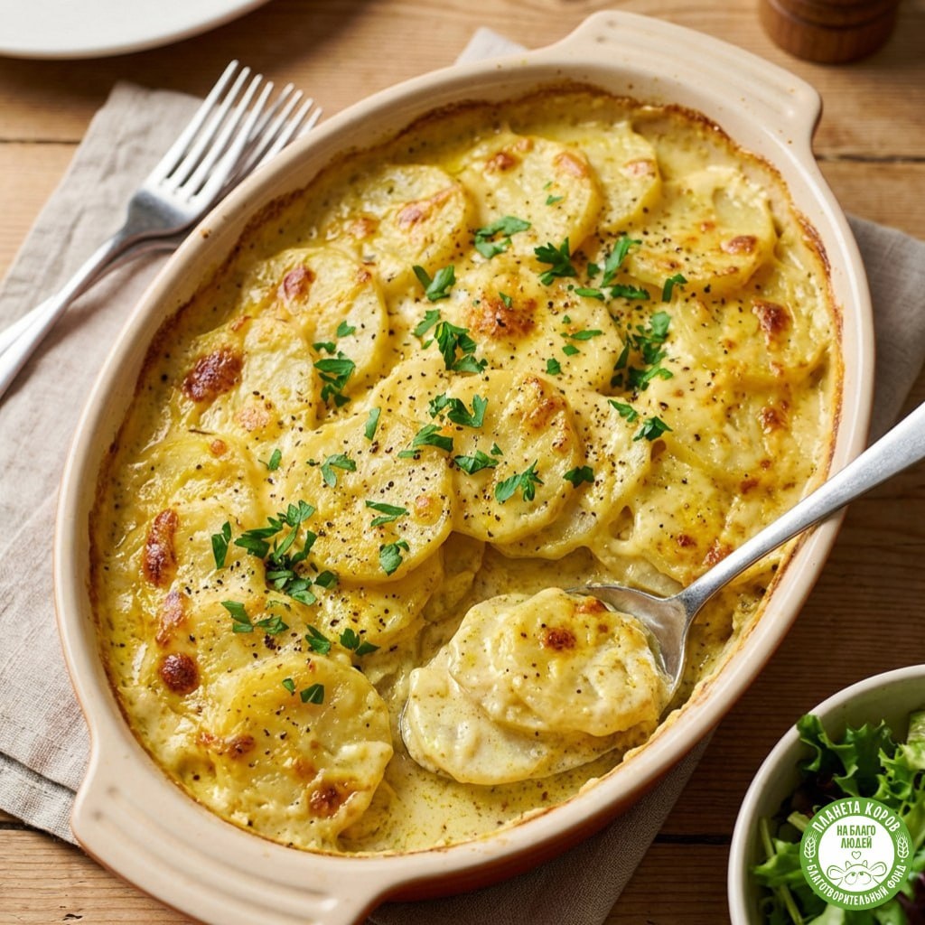 Картофель «Ароматный» Ингредиенты Картофель – 500 г Молоко – 400 мл Сыр твёрдый – 300 г Сметана 20% - 100гр Асафетида 1ч.л. Масло сливочное – 50 г Перец чёрный молотый – 1 щепотка Карри приправа 1 ч.л. Соль – по вкусу Приготовление: Обильно смазать сливочным маслом стенки и дно формы для запекания. В чашу миксера вылить молоко, сметану, перец, соль и карри. Смесь взбить миксером. Картофель очистить, промыть и нарезать тонкими кружочками толщиной 3–4 мм. Выложить картофель в форму «чешуёй». Сыр натереть на крупной тёрке. Картофель покрыть слоем сыра. Залить картофель молочной заливкой. Форму поставить в духовку и запекать в течение 1 часа при температуре 160 градусов.