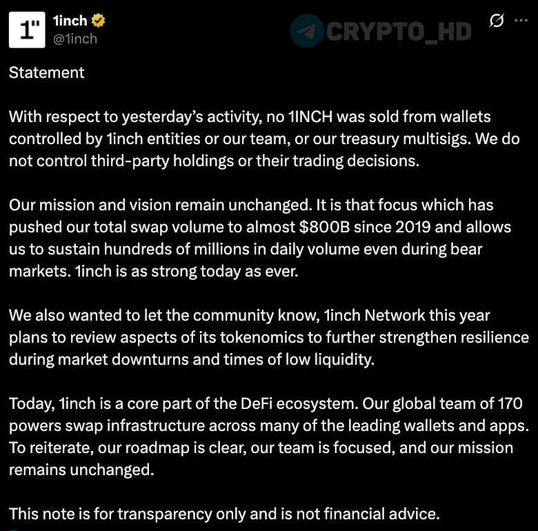 ответ Что касается вчерашней активности: ни одна продажа 1INCH не была осуществлена с кошельков, контролируемых структурами 1INCH, нашей командой или из наших резервов. Мы не контролируем активы третьих лиц и их торговые решения. Наша миссия и видение остаются неизменными. Именно эта целеустремленность позволила нам с 2019 года обеспечить общий объем свопов почти в $800b и поддерживать ежедневный объем в сотни миллионов долларов даже во время медвежьих рынков. Также хотим сообщить сообществу, что в этом году 1inch Network планирует пересмотреть некоторые аспекты токеномики, чтобы еще больше повысить устойчивость во время рыночных спадов и периодов низкой ликвидности. Сегодня 1inch – ключевой элемент экосистемы DeFi. Наша глобальная команда из 170 человек обеспечивает работу обменной инфраструктуры во многих ведущих кошельках и приложениях. Вчера: распродажа 1INCH Crypto Headlines