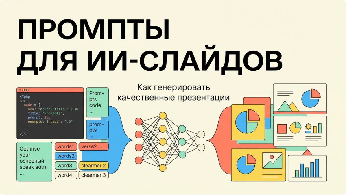 Когда завтра предстоит важная защита или питч перед инвесторами, последнее, чем хочется заниматься — это часами двигать иконки в PowerPoint. Сегодня многие перекладывают эту рутину на ИИ, но результат часто разочаровывает: картинки не в тему, текст «плывет», а стиль напоминает дешевый клипарт из нулевых. Чтобы генерация слайдов приносила эстетичное решение, а не головную боль, нужно понимать, как работают промпты для нейросети. По моему опыту, секрет не в сложности слов, а в их конкретике.
