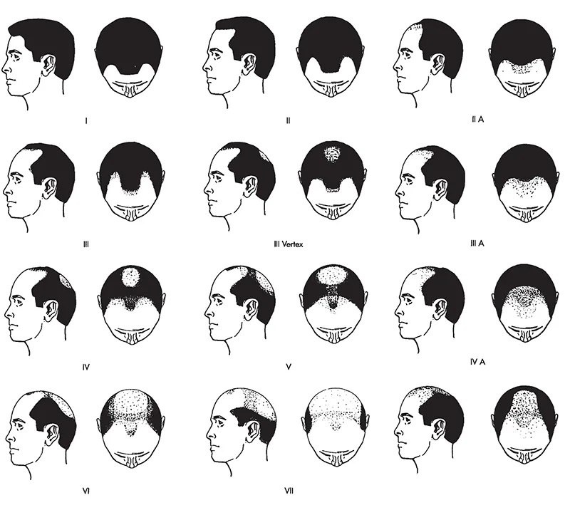 Друзья, сегодня предлагаю поговорить о серьезном! 🧠 Выпадение волос у мужчин — одна из самых распространённых проблем, с которой сталкивается более 50% мужчин старше 40 лет. Основной виновник — андрогенетическая алопеция (АГА), вызванная генетическими и гормональными факторами. Но как понять, что именно происходит, и можно ли что-то сделать? 🤔 АГА — это генетически обусловленное состояние, связанное с повышенной чувствительностью волосяных фолликулов к дигидротестостерону (ДГТ), производному тестостерона. Под действием ДГТ фолликулы уменьшаются, цикл роста волос сокращается, и в итоге волосы становятся тоньше, короче и постепенно перестают расти. ● Ранняя стадия: залысины в области лба и висков. ● Прогрессирующая стадия: поредение волос на макушке. ● Поздняя стадия: полное облысение в верхней части головы, при сохранении волос на затылке и висках. Если у ваших родственников по мужской линии наблюдается облысение, риск развития АГА у вас значительно выше. ДГТ вызывает миниатюризацию ф