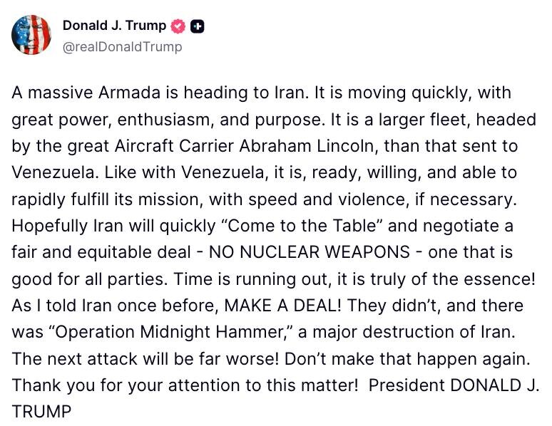 Она движется быстро, с огромной силой, решимостью и целеустремленностью. Это более крупный флот во главе с великолепным авианосцем «Авраам Линкольн», чем тот, что был отправлен к Венесуэле. Как и в случае с Венесуэлой, он готов и способен быстро выполнить свою миссию со скоростью и силой, если потребуется. Будем надеяться, что Иран быстро «сядет за стол переговоров» и договорится о справедливой и равноправной сделке, БЕЗ ЯДЕРНОГО ОРУЖИЯ, которая будет выгодна всем сторонам. Время истекает, счет идет буквально на секунды! Как я уже говорил Ирану ранее: ЗАКЛЮЧАЙТЕ СДЕЛКУ! Они не стали этого делать, и последовала операция «Midnight Hammer» – масштабное разрушение Ирана. Следующая атака будет намного хуже! Не допустите, чтобы это повторилось снова. Благодарю вас за внимание к этому вопросу! Crypto Headlines