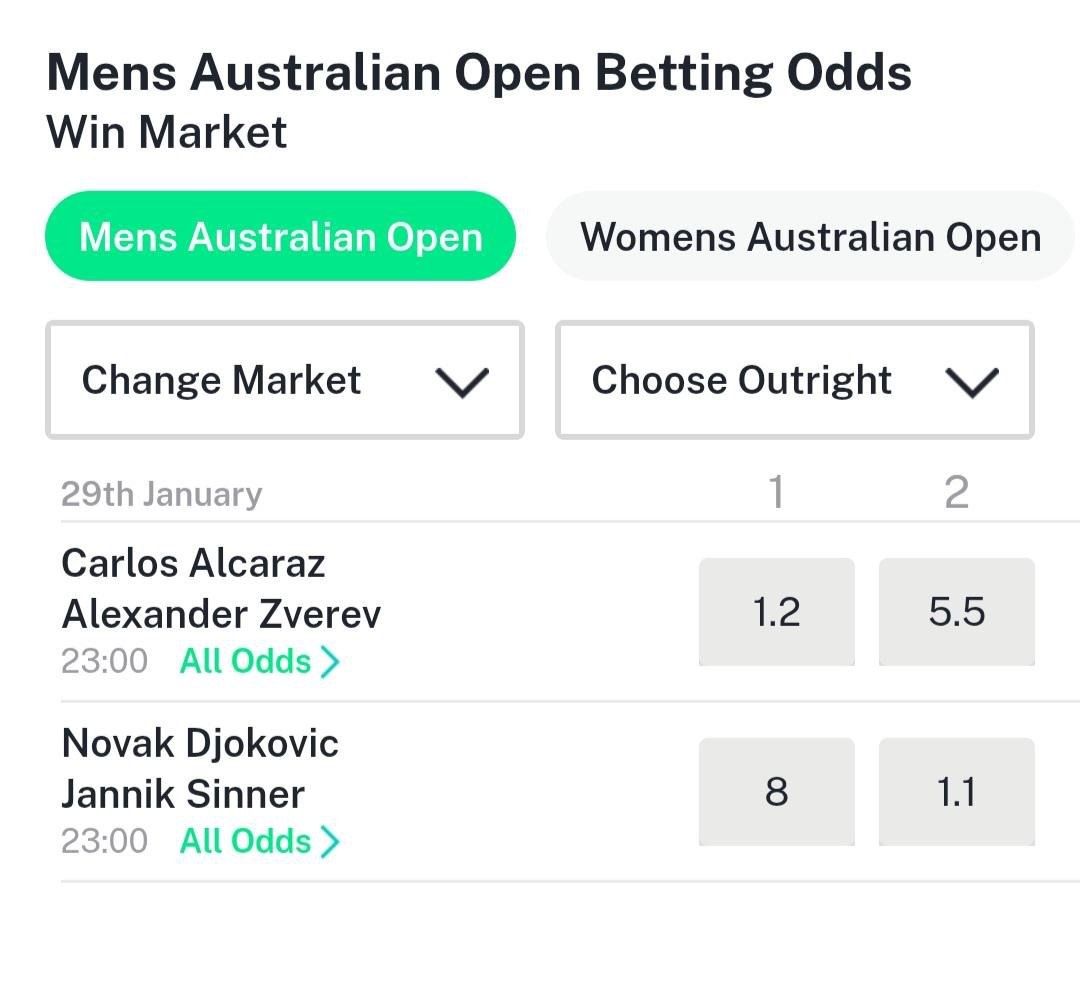 составляет 8.00 или выше. На скрине коэффы на Australian Open: Карлос Алькараз Александр Зверев 1.2 5.5 Новак Джокович Янник Синнер 8 1.1 Подпишись на Эйс и точка