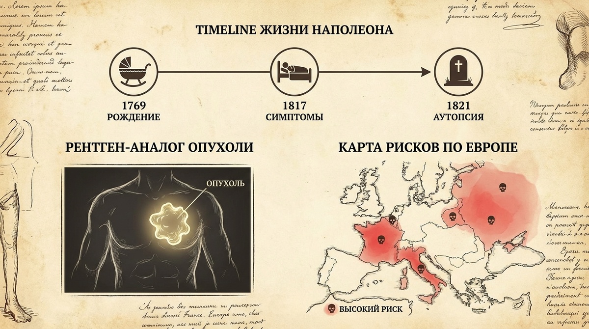 Наполеон Бонапарт, император французов, покорил Европу, но пал жертвой собственной физиологии. С 1817 года на острове Святой Елены его мучили неудержимая рвота с кровью, анемия, похудение до 40 кг и асцит — классическая картина рака желудка с метастазами в печень. Аутопсия 6 мая 1821 года (проведена Франческо Антоммарки) выявила: опухоль 10 см в желудке, перфорацию и цирроз печени. Вес мозга — всего 1300 г (норма 1400+), что указывает на истощение. Но теории множатся: мышьяк в волосах (токсикология 1961 г.), амебиаз от плохой воды или даже сифилис.