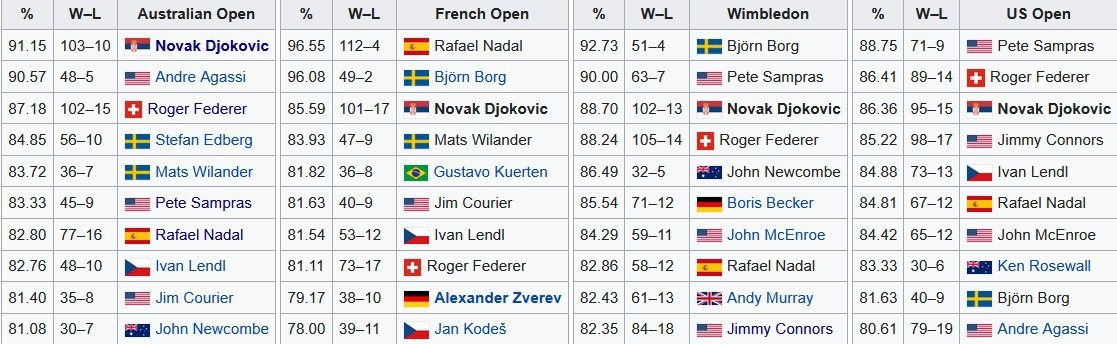 🔥 Новак Джокович обошел Роджера Федерера по количеству побед на Australian Open — у него 103 победы! Другие цели Джоковича в этом году — Уимблдон и US Open: • Ему нужно выиграть 3 матча на Уимблдоне, чтобы догнать Федерера, а 4 матча, чтобы стать лидером по количеству побед. • На US Open у Джимми Коннорса 98 побед, и это рекорд. Если Джокович выиграет 4 матча, то обгонит Коннорса, а если дойдет до полуфинала, то станет первым теннисистом, выигравшим 100 матчей на всех четырех турнирах Большого шлема. Интересно, что в Австралии больше всего побед у Новака Джоковича (как среди мужчин, так и среди женщин), на Ролан Гаррос — у Рафаэля Надаля (112 побед). На Уимблдоне единственная женщина, выигравшая 100+ матчей, — Мартина Навратилова (120 побед). В США только две женщины выиграли 100+ матчей: Крис Эверт (101 победа) и Серена Уильямс (108 побед). Подпишись на Эйс и точка