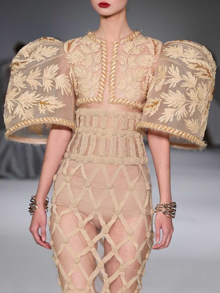 Посвящённую Габриэль Шанель коллекцию YANINA Couture представили в историческом Pavillon Cambon на Rue Cambon, где когда-то работала Коко Шанель. Главной темой коллекции стал колос как символ силы и умения расти вопреки обстоятельствам. Он появляется на образах в виде золотых вышивок, которые стали новой авторской техникой модного дома. Помимо этого, впервые в истории бренда в кутюре используется натуральная рафия (волокно из листьев пальмы), а также ручное плетение, вышивка соломкой и техника «вприкреп». В декоре появились мерцающий стеклярус, бисер, а также роскошные цветочные элементы в виде роз из шифоновых лент, ажурных цветов в технике ришельё, пышных камелий и макраме из шифона. Это не история великого модельера - это моё личное восприятие жизненного пути Габриэль. О том, как человек без поддержки и представления о роскоши смог создать новую роскошь для свободной женщины. И если у вас есть мечта, желание, настойчивость - вы прорастёте даже сквозь асфальт. В этом смысл этой колле