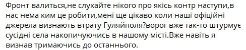 : Фронт рушится, не слушайте никого о каких-то контрнаступлениях, у нас некому это делать. Мне ещё интересно, когда наши официальные источники признают потерю Гуляй-поля? Враг уже штурмует соседние деревни, собираясь в нашем городе. Даже я уже признал это... А между прочим сегодня ровно месяц с тех пор, как группировка "Восток" заявила об освобождении н.п. Гуляй-поле. С тех пор какой чуши со стороны публичных лиц ВСУ мы не слышали: и что все флаги — подделка, и что Гуляй-поле отбито, и что русские бегут. Чем обусловлен такой отрыв от реальности — будь-то прикрытие свое провала перед высшим политическим руководством или осознанная позиция Киева в ходе текущих переговоров — неважно. Важно лишь то, что даже до рядового заукраинца уже доходит, что официальные источники ему врут, а успехов на фронте для ВСУ в обозримом будущем не предвидится. Тем не менее, это уже не остановит конвейер ТЦК по уничтожению украинцев — они сделали свой выбор — пришло пора платить по счетам.