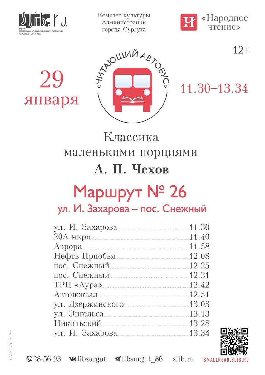 🚍 Участниками акции станут пассажиры автобусного маршрута № 26. Стартует автобус в 11:30 от остановки «ул. Ивана Захарова». Отличить «читающий» автобус от других просто – он будет отмечен яркими стикерами и афишей. Пассажиры «Читающего автобуса» узнают о жизни и творчестве Антона Чехова, услышат рассказы «Восклицательный знак» и «Пассажир 1-го класса» в прочтении сотрудников Централизованной библиотечной системы Сургута. Самым активным участникам вручат в подарок книги пятого этапа проекта «Народное чтение». Акцию «Читающий автобус» сургутские библиотеки ежегодно организуют с 2014 года. В этом году пассажиров знакомят с Михаилом Зощенко, Аркадием Аверченко, Ильёй Ильфом и Евгением Петровым, Тэффи, Антоном Чеховым. 🗓️ 29 января ⏰ с 11.30 до 13.34 📞 подробная информация по телефону: 28-62-53 Мы в Max | ВК | ОК | Телеграм | Официальный портал | Дзен