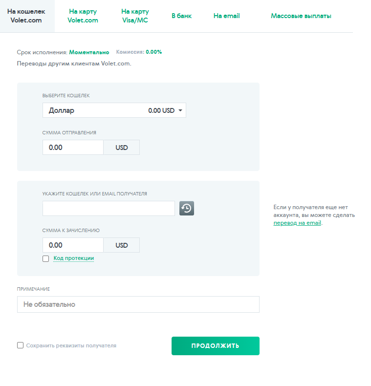Интересный момент: если у адресата ещё нет кошелька в системе Volet, можно отправить ему перевод по email. После регистрации по этому почтовому ящику в Volet, он сразу получит свой перевод.