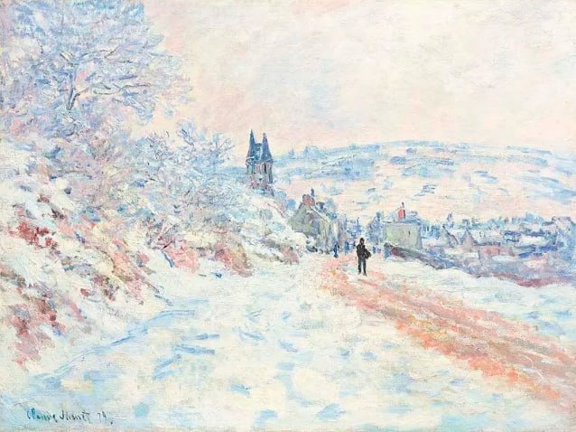 Но зима занимала в его творчестве особое место. Он писал её как игру света. Картина «Дорога на Ветёй. Снежный эффект» — один из лучших примеров. Здесь нет ослепительной белизны: снег переливается голубыми и розовыми мазками, дорога словно тает под ногами, а воздух кажется наполненным морозным светом. Фигуры людей едва намечены. В живописи снег пишут не «белилами», а десятками оттенков — голубыми, розовыми, сиреневыми, охристыми, лимонными. Теми самыми цветами, которые обычный глаз не всегда замечает. Именно это и сделали импрессионисты особенно ярко: они передавали эффект искр на снегу. — А вы замечали, сколько разных цветов на самом деле скрывается в снеге?