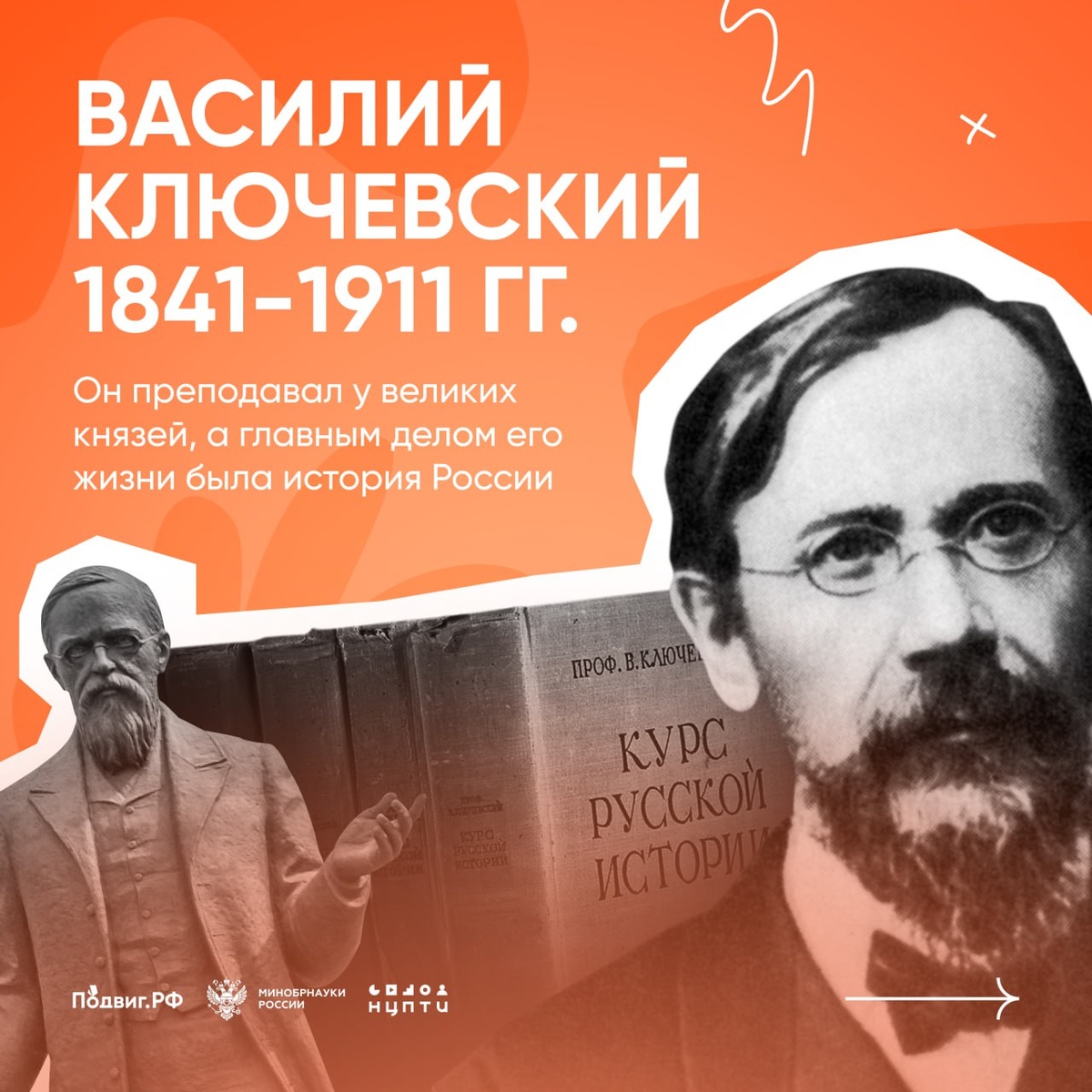 Собрали факты о Ключевском, его жизни и трудах в карточках 👆 Читай также: — Александр Суворов: детство, личность, сражения — Михаил Кутузов: детство, личность, сражения — Великие полководцы России 🧡Подвиг.РФ | Поддержать канал голосом #подвигрф #подвигрф_про_личностей