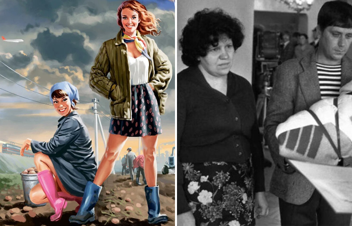 Даже если женщине удавалось как-то устроиться в жизни и избежать тяжелой физической работы, все равно домашняя нагрузка была огромной. Патриархальные устои о том, что женщина должна в одиночку тащить весь быт на себе, была все еще очень распространена. Именно на ее плечи ложилась забота о детях, о муже, о престарелых родителях и обо всех заболевших. Именно она после работы бежит готовить ужин, на родительское собрание, предварительно отстояв в очередях. Если добавить к этому постоянные стрессы, скудное питание, то вопросов к внешности женщин не возникнет никаких.