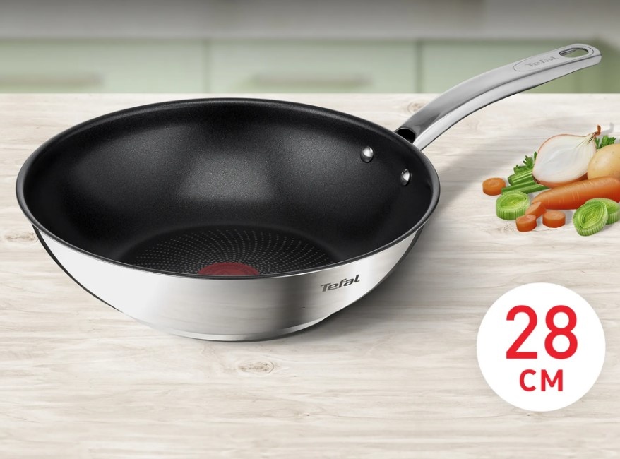 Сковорода-вок Tefal имеет глубокую форму и высокие стенки, что идеально для быстрого обжаривания, тушения и приготовления азиатских блюд. Рекомендуем сковороду-вок Tefal Unlimited 28 см или Tefal Intuition G6 28см за их долговечность и отличные антипригарные свойства.