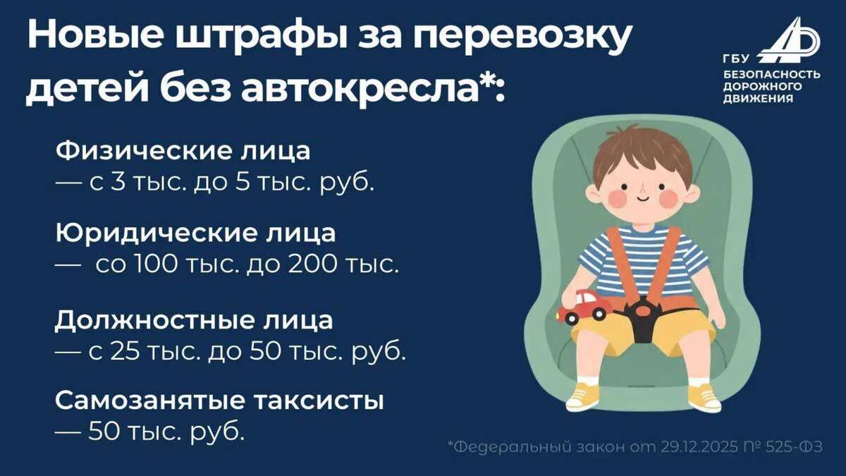 При столкновении даже на скорости 50 км/ч вес ребёнка увеличивается в десятки раз. Удержать его на руках физически невозможно. Проверьте, правильно ли установлено автокресло и перевозите детей безопасно. Новые штрафы за перевозку детей без автокресла Соответствующий федеральный закон, который внёс изменения в КоАП РФ, вступил в силу 9 января. Штраф для физических лиц увеличен до 5 тыс. руб., для юридических лиц — до 200 тыс. руб., для должностных лиц и самозанятых водителей такси он установлен в размере 50 тыс. руб. ❗️Напомним, по ПДД перевозить детей с использованием специальной удерживающей системы необходимо до достижения ими 7-летнего возраста, на переднем сиденье – до 12 лет. Госавтоинспекция рекомендует использовать детские удерживающие устройства до достижения 12 лет даже на заднем сиденье. Это обеспечит максимальную безопасность при перевозке.
