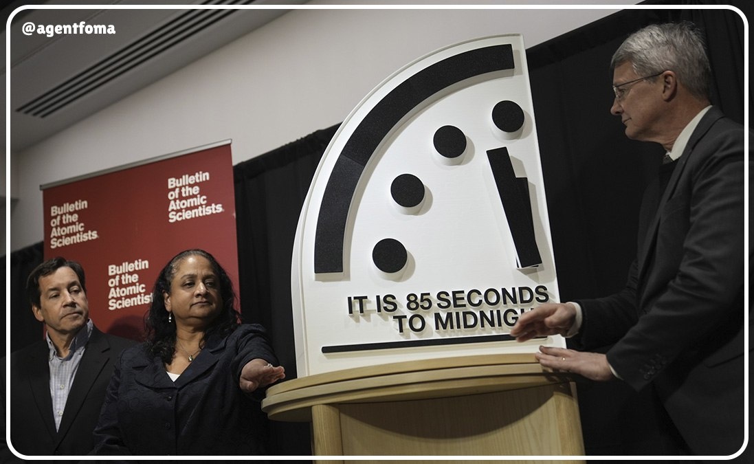 ! Стрелки символических «часов Судного дня» сдвинулись ещё ближе к катастрофе: учёные перевели их на 4 секунды вперёд. Теперь до «ядерной полуночи» остаётся всего 85 секунд. «Часы Судного дня» - проект журнала Bulletin of the Atomic Scientists, где полночь символизирует глобальную ядерную катастрофу. Положение стрелок ежегодно пересматривают эксперты, оценивая уровень угроз: от ядерного оружия до климатических изменений и новых технологий. 👀 @agentfoma собирает новости от других агентов по всему миру... Подписывайтесь, чтобы не потерять!