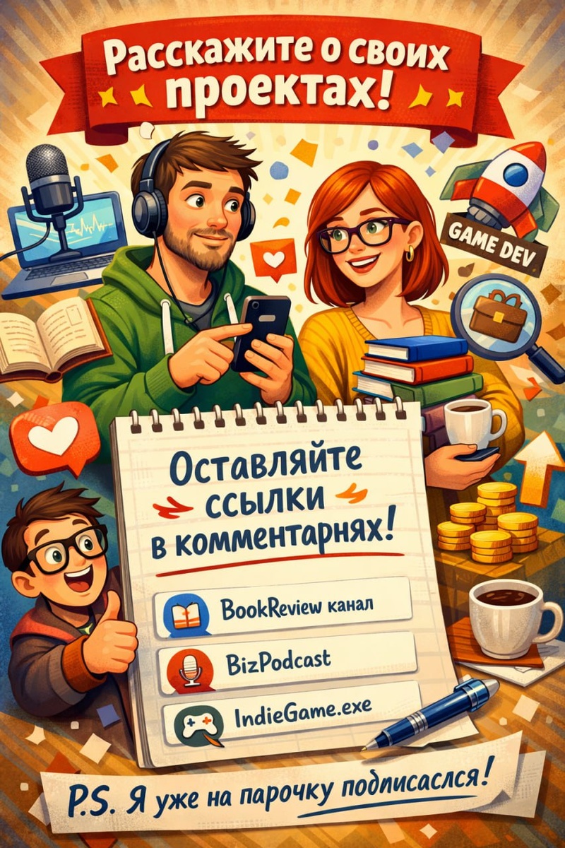 И вообще-то у вас есть интересные проекты, а вы молчите! Так что в комментариях к этой записи предлагаем вам рекламировать свои проекты и познакомиться. Канал, посвященный книгам, бизнес-подкаст, рекрутинговый сервис, инди-игра — давайте ссылки в комментариях, не стесняйтесь! P.S. Я вот лично подписался на пару каналов.