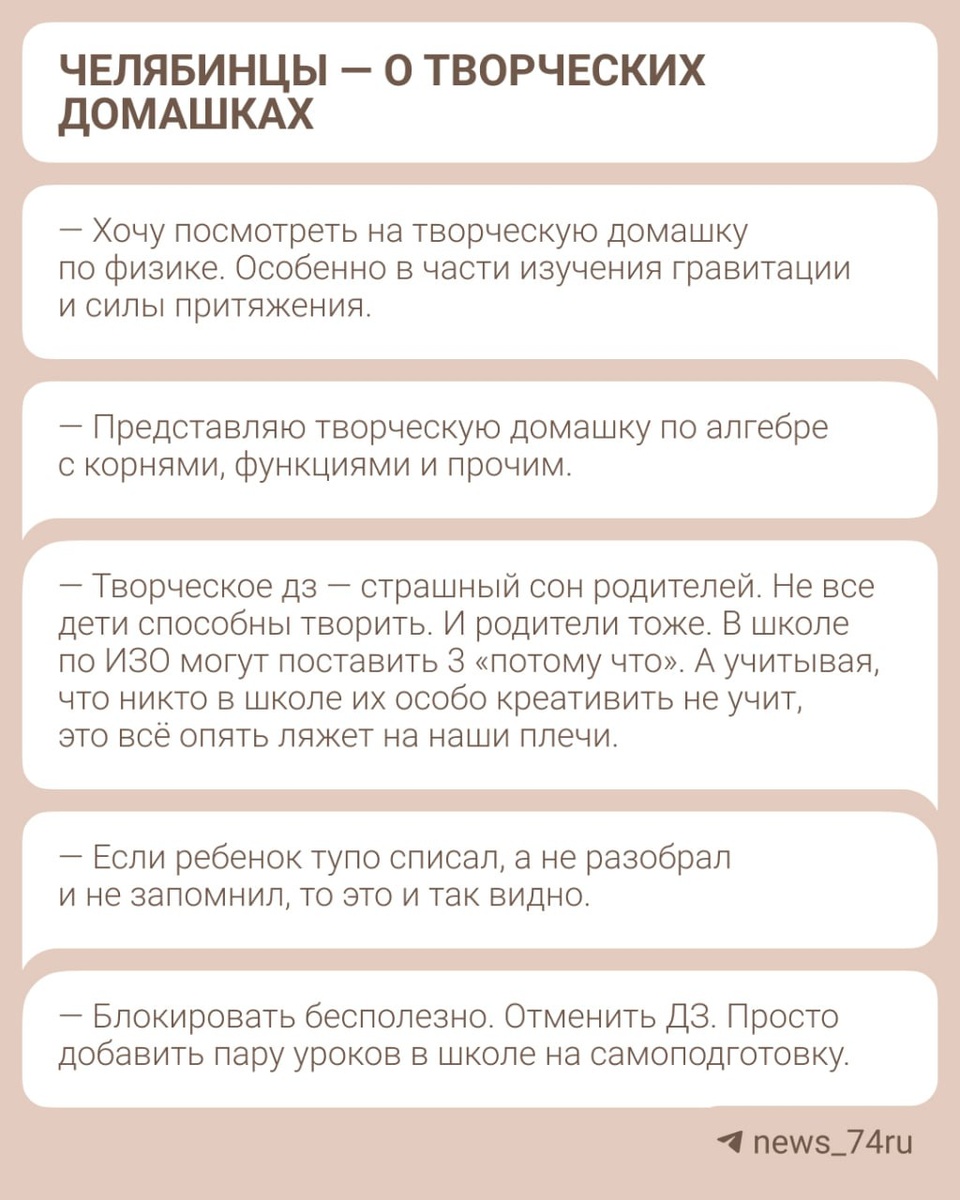 Челябинцы активно включились в обсуждение блокировки сайта ГДЗ и подготовкой домашки школьниками через нейросети. В Госдуме предложили другой путь — изменить формат самих домашних заданий, делать их более творческими. Но южноуральцы скептически отнеслись к такому предложению: у одних оно вызвало еще больше вопросов, другие признались, что сами заглядывают в ГДЗ, чтобы перепроверить ребенка. Собрали самые яркие комментарии в карточки ⬆️