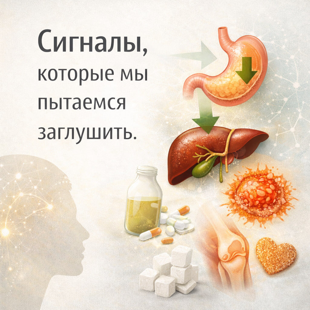 🧠Сохраните себе! Это важно. Очень часто тело подаёт сигналы, а мы пытаемся их заглушить. Но каждый симптом — это подсказка. Разберем каждый из них 👇 🔸Если энергия падает резко Вы просыпаетесь нормально. Но к обеду — “пустота”, мутная голова, нет ресурса. Это не просто усталость. Часто это сигнал, что пищеварение не даёт телу полноценного усвоения. Организм включает режим экономии. И вы думаете: «Мне не хватает силы». На самом деле — не хватает адаптации. 🔸Если тянет на сладкое Это не про характер. Тяга часто возникает, когда: — нарушено желчевыделение — есть скрытое воспаление — нестабилен уровень сахара Мозг ищет быстрый способ компенсации. 🔸Если отеки возвращаются Это не просто «задержка воды». Когда пищеварительная система перегружена, тело хуже выводит продукты обмена. Жидкость задерживается. Сосуды перегружаются. Ткани недополучают питание. 🔸Если часто "ноют" суставы без причины Часто это не только про возраст. Это может быть следствием системного воспаления, которое начин