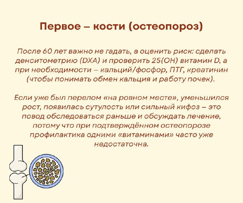 »! Чаще всего он происходит не из-за аварий или серьёзных травм. Обычно всё выглядит куда прозаичнее: человек поскользнулся дома, оступился на улице — и дальше жизнь резко меняется. Перелом шейки бедра — один из самых тяжёлых переломов в пожилом возрасте. Потому что в этом месте нарушается кровоснабжение и срастание идёт тяжело или не идёт вовсе. Поэтому нередко требуется операция, а восстановление занимает месяцы. Почему это происходит именно у пожилых? С возрастом кость теряет плотность (остеопороз), мышцы слабеют, равновесие становится хуже. Даже небольшой удар или падение, которое в молодости прошло бы без последствий, после 60–70 лет может закончиться переломом. Важно понимать: перелом шейки бедра — это не просто боль. Это риск потери самостоятельности, длительного лежачего режима, осложнений со стороны сердца, лёгких, сосудов. Но хорошая новость в том, что большую часть этих переломов можно предотвратить! Листайте карточки 👉 Если человек стал чаще спотыкаться, шататься, б