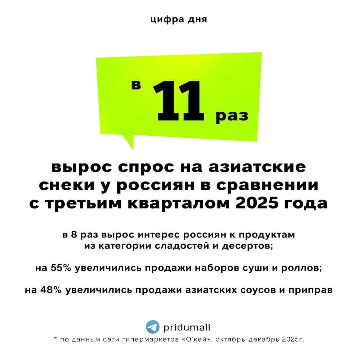 В рубрике «Цифра дня» свежие данные О’КЕЙ — в 11 раз вырос спрос у россиян на азиатские снеки в 4 квартале 2025 года. Во второй половине 2025 года спрос на азиатскую кухню заметно ускорился: в 3 квартале он вырос на 36%, а 4 квартале — уже на 89% по сравнению с предыдущим периодом. Напомню ещё про исследование 👉 по корейской кухне из октября 2025 года. 👉подписаться на @pridumali #исследования