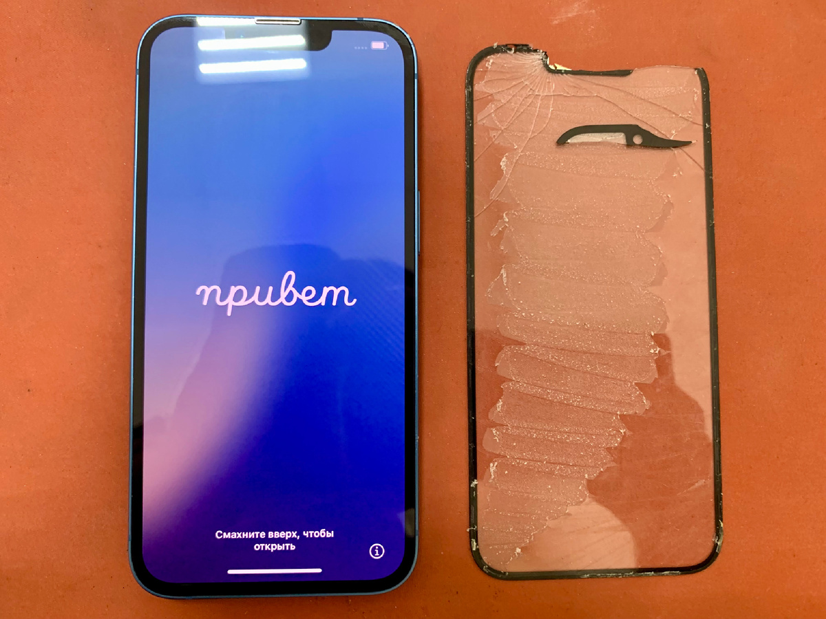 В ремонт принесли iPhone 14 с разбитым стеклом дисплея. Экран в трещинах, но изображение ровное: без полос, пятен и провалов по яркости. Сенсор работает, значит матрица живая. В таких случаях я всегда сначала объясняю варианты, а не просто «меняем дисплей и всё».