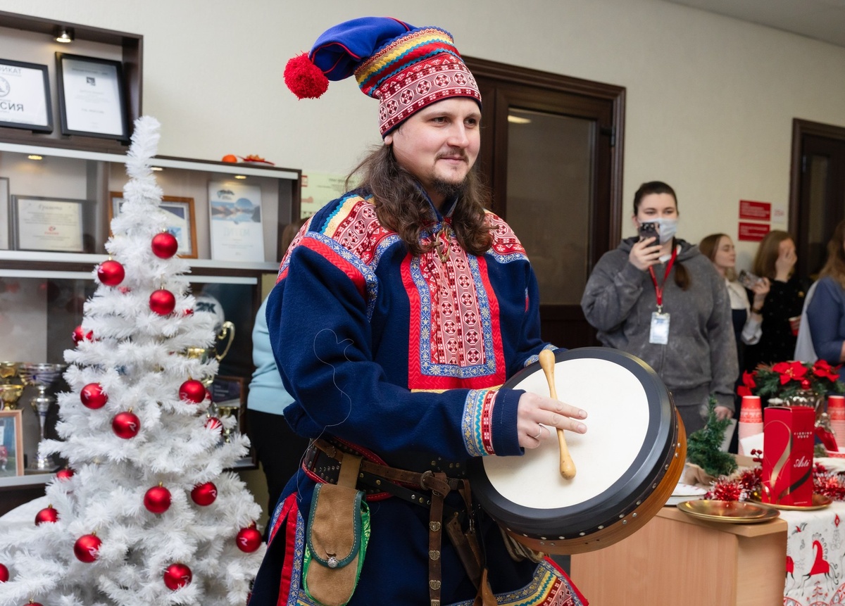 Якутский шаман Кулан, поздравил гаданием на бубне и предрек счастливый 2026 год. И конечно же, Дед Мороз Талви УККО родом из Карелии, с настоящими карельскими дарами: пряниками, травяным чаем и морошковым вареньем! Дедушка Талви поздравил всех сотрудников авиакомпании и пожелал: